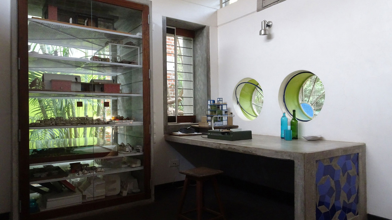 This small-scale project is an extension to the existing architecture studio based in Auroville. Completed a decade after the first phase was constructed, by the same architect. It imbues the same refined architectural qualities from the interiors to the landscaping. It is a space for art, discussion, wonder, as well as work. This is felt as one brushes their feet against the rough Cuddapah stone, or admires the calligraphy pinned to the sliding panels next to the wooden desk. Numerous textures, from the low concrete ceiling made from mango wood formwork, to the achakali brick cladding the vault’s underside, to the smooth shell-lime plaster of the walls, give the user a constant tactile experience of the space.
