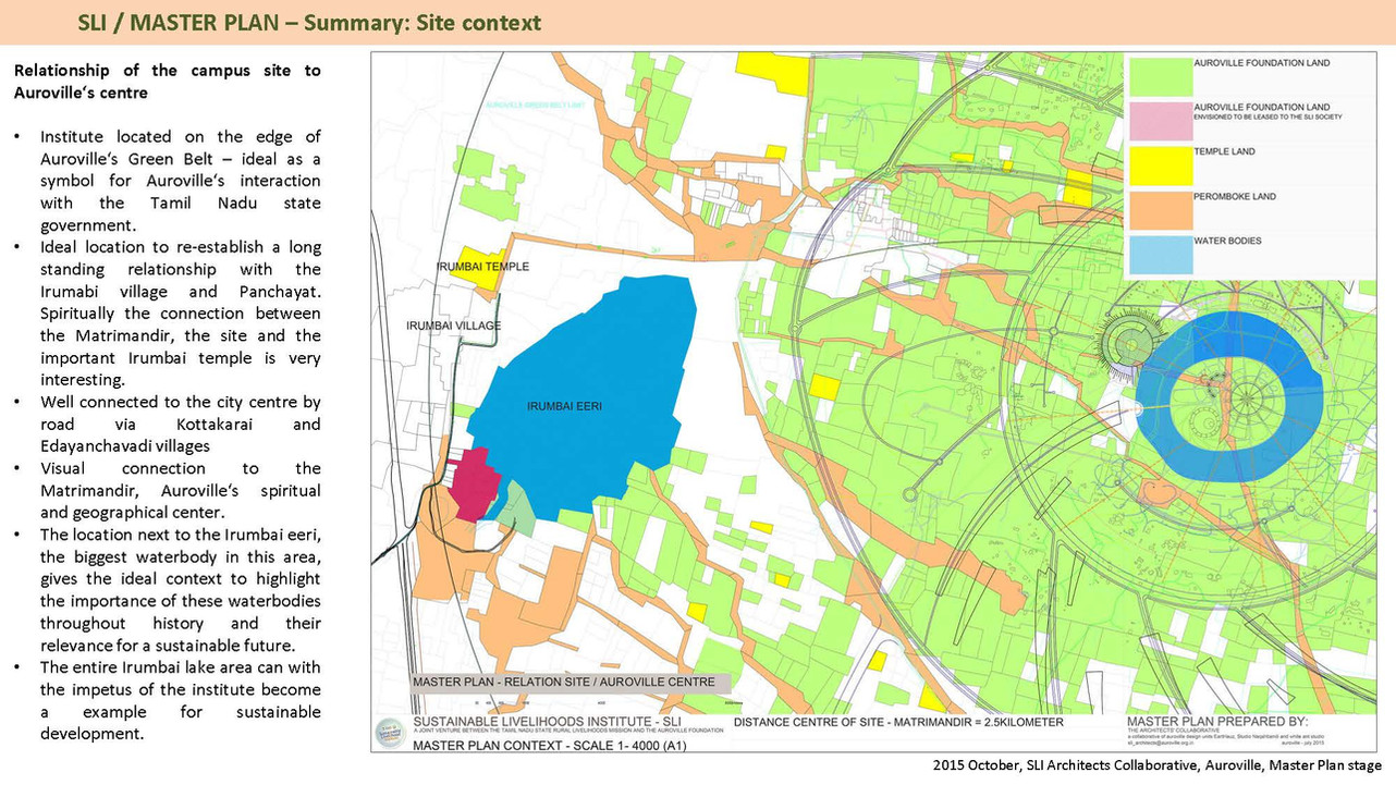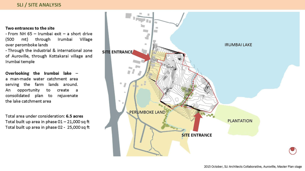 A consortium of three architecture firms from Auroville under the working name of Architects Collaborative was formed and followed a process of Dreamweaving – a process evolved in Auroville - which consciously aims for the Highest Common Factor rather than the Lowest Common Denominator in a team work. Link to Dreamcatchers pdf. The Master Plan of SLI on the designated site near Irumbai Lake was thus finalised in a harmonious and collaborative manner, after which the project didnot go further in its physical manifestation. However SLI continued to conduct field workshops within Auroville and its bio region till 2019, delivering some important milestones in the realisation of the aims set up TNRLM.